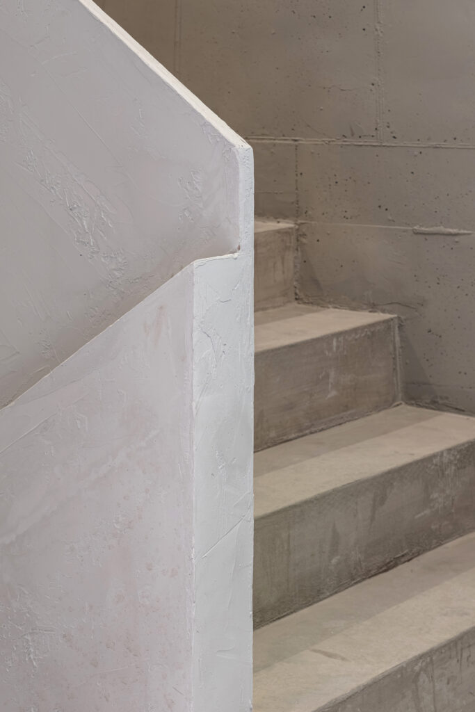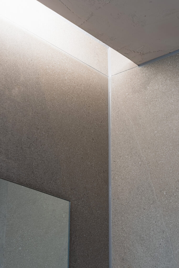 저층부는 따뜻한 그레이 톤의 스톤 마감과 깊이감 있는 입면 구성을 적용해